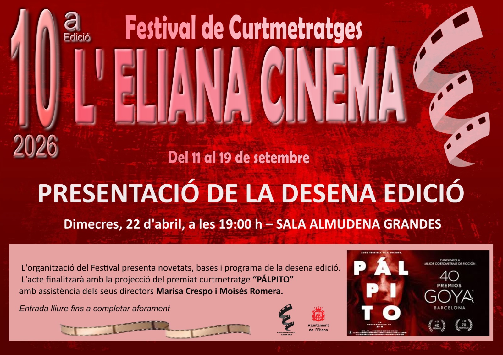 L’ELIANA CINEMA es un festival de cortometrajes inclusivo y diverso, que tiene lugar en el pueblo de l’Eliana (Valencia) y dirigido a personas de todas las edades y niveles de experiencia en el cine. Se intenta fomentar nuevas trayectorias en el mundo del audiovisual.